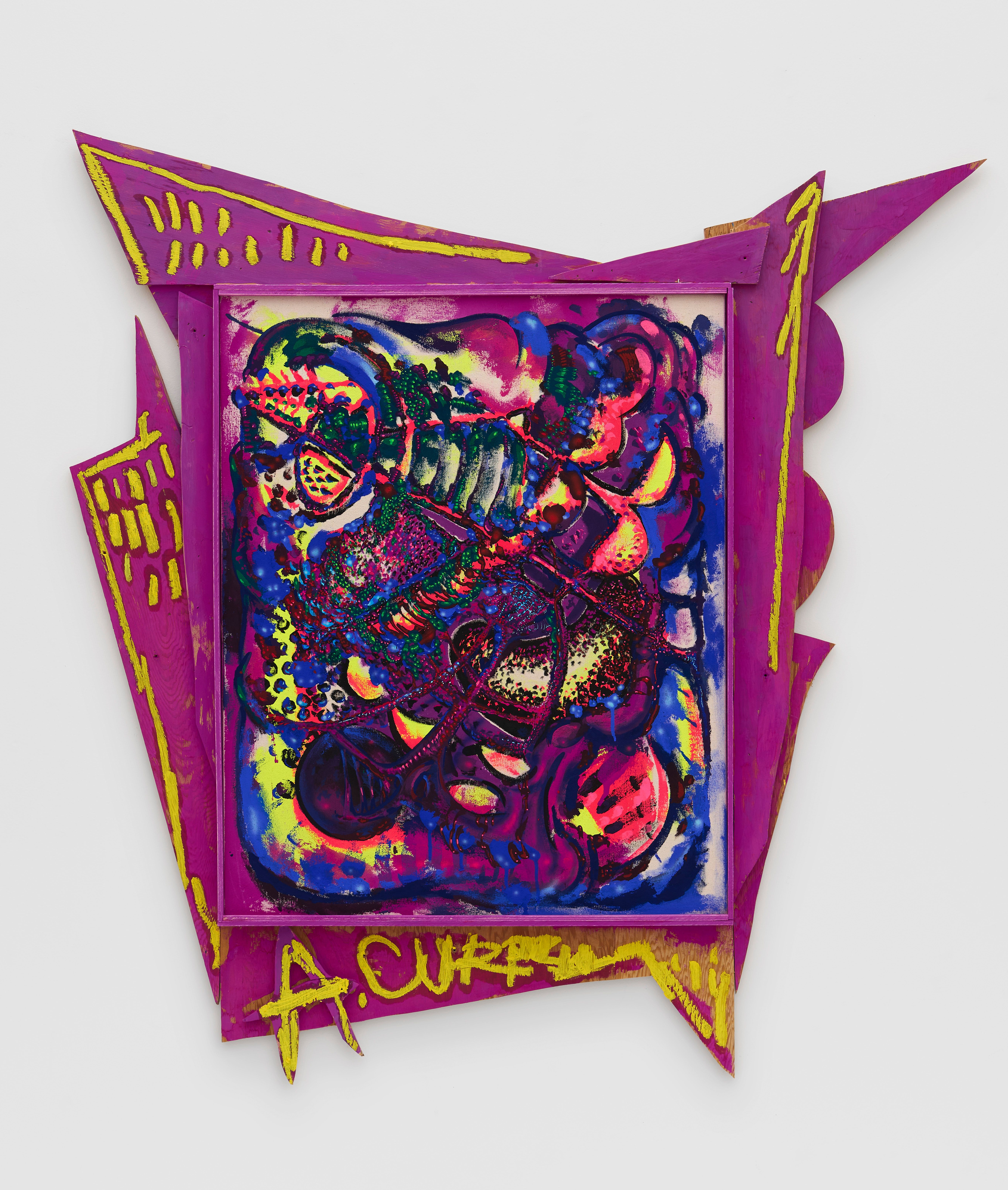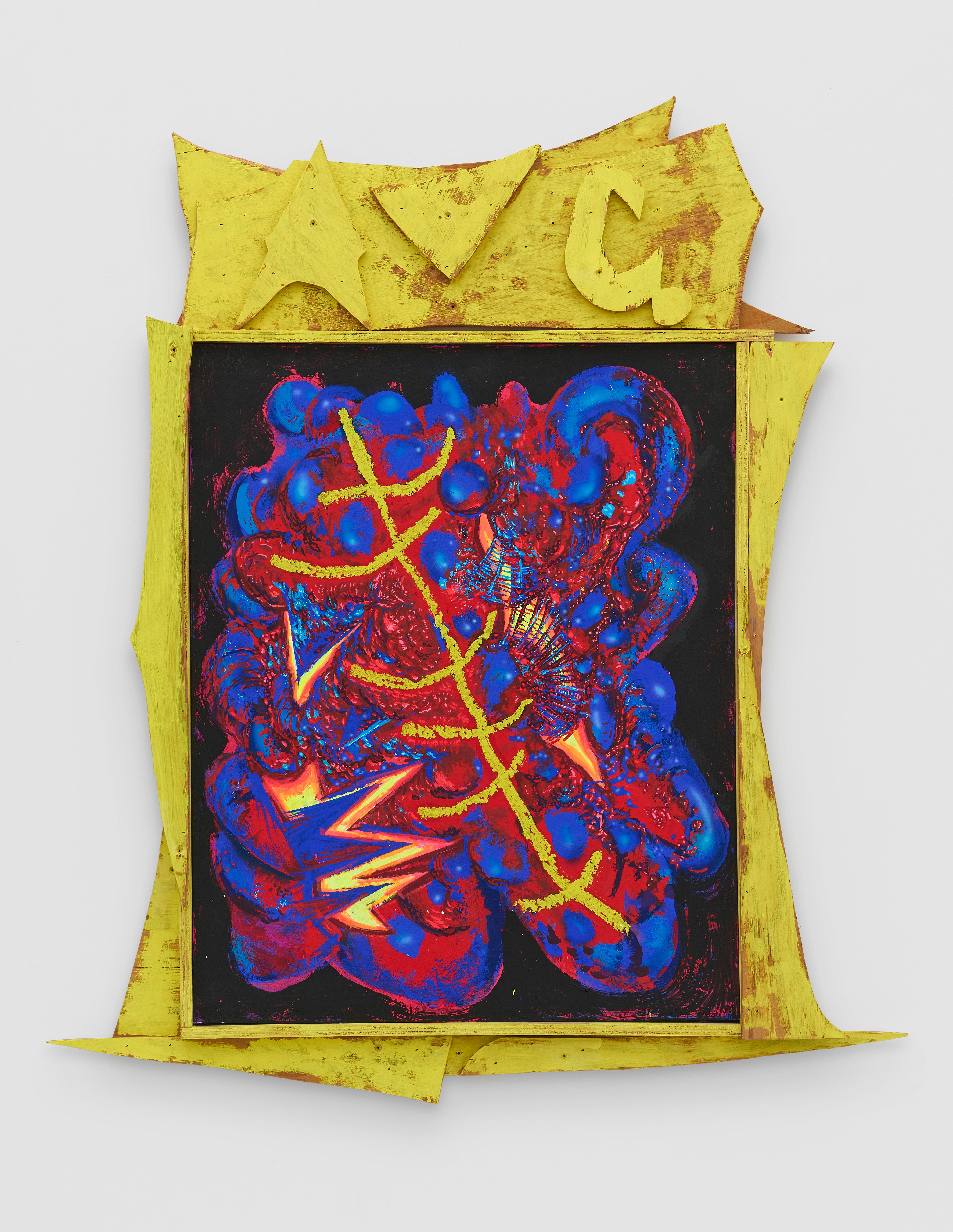 Aaron Curry, Doomsday Guck Abstraction (Yellow), 2021. Acrylic gouache and oil on canvas in artist’s frame, 44.8 x 38.3 x 2.8”(114 x 97 x 7 cm)