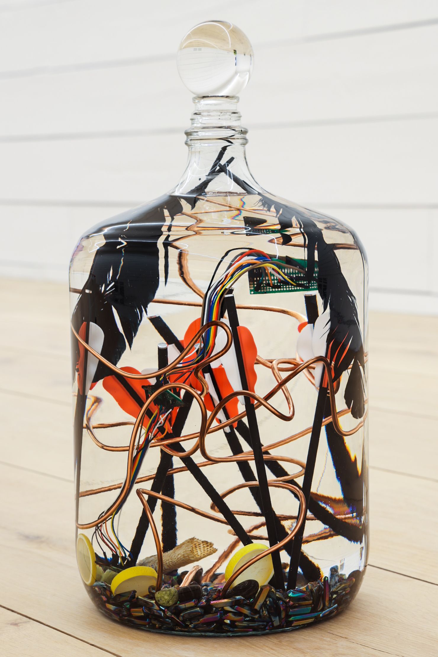 Spell to block the singularity, 2021 Taxidermied rattlesnake head and rattler, arrows, synthetic lemons, copper wire, rainbow titanium coated quartz crystals, feathers, tourmaline, serpentine, programmed and destroyed ai hardware, destroyed computer memory, preservative oil, glass, crystal sphere, and other unnamed things 12 x 12 x 24” (30.5 x 30.5 x 61 cm)