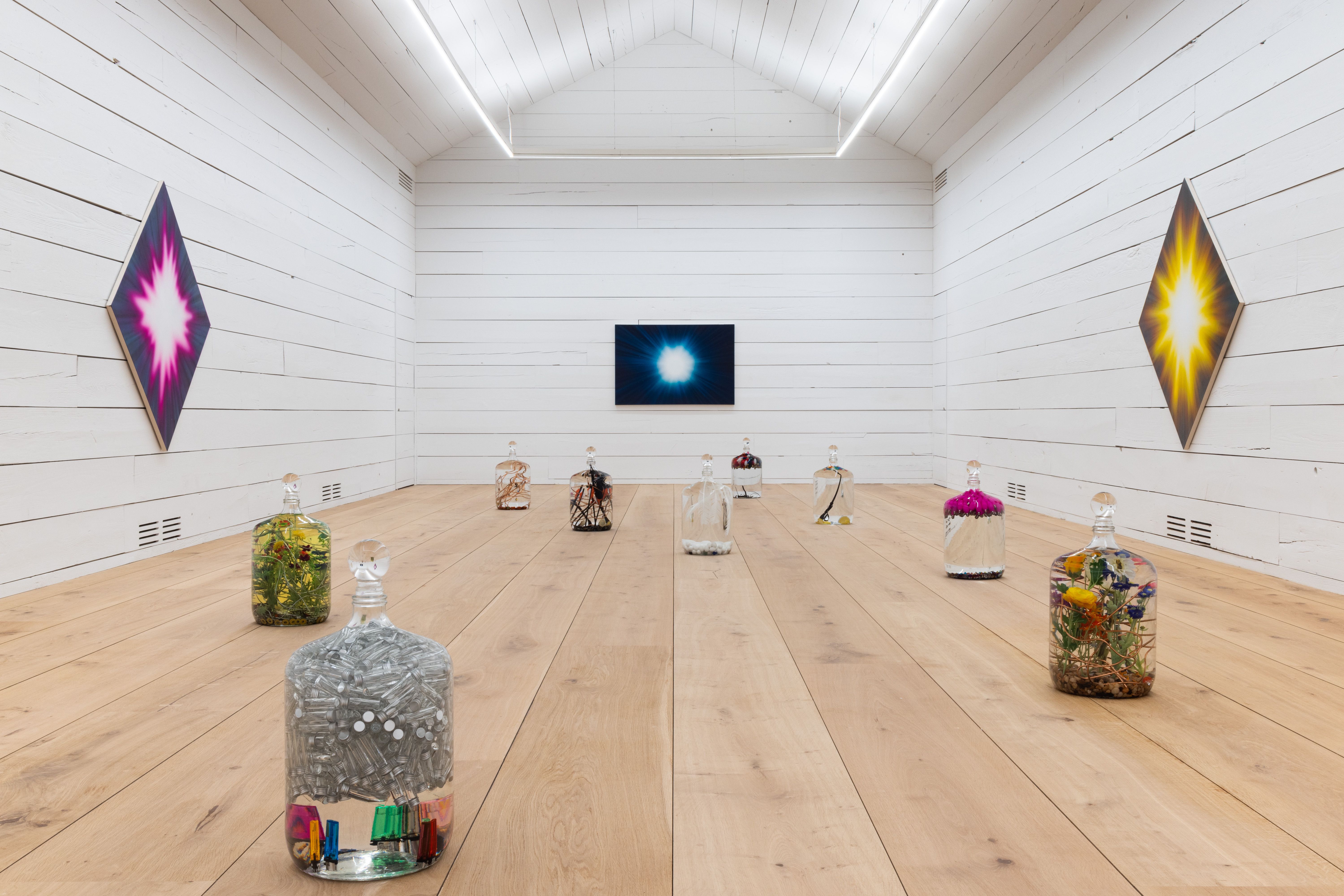 Spell to ward off the singularity, 2021 L’s breath in borosilicate glass and aluminum vessels, destroyed computer memory, lighters, preservative oil, flint glass vessel, quartz crystal sphere, and other unnamed things 12 x 12 x 24” (31 x 31 x 61 cm)