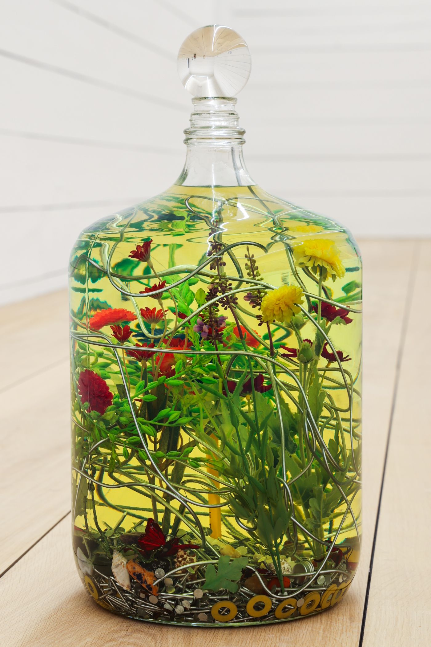 Spell for being the witness, 2019 Solid copper wire, fishing lures without hooks, red jasper, Venetian glass vessel, preservative oil, crystal sphere, and other unnamed things 12 x 12 x 24” (30.5 x 30.5 x 61 cm)
