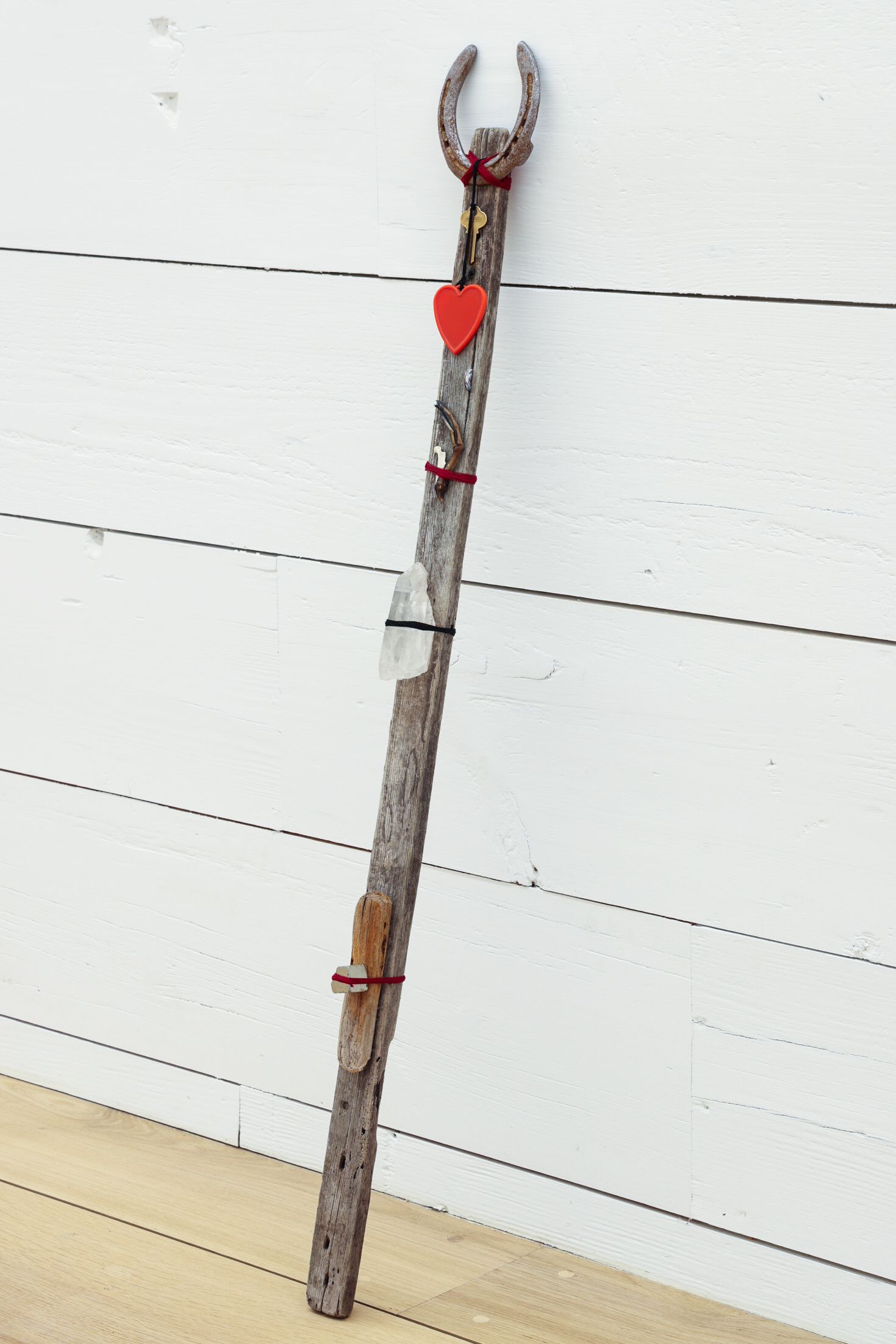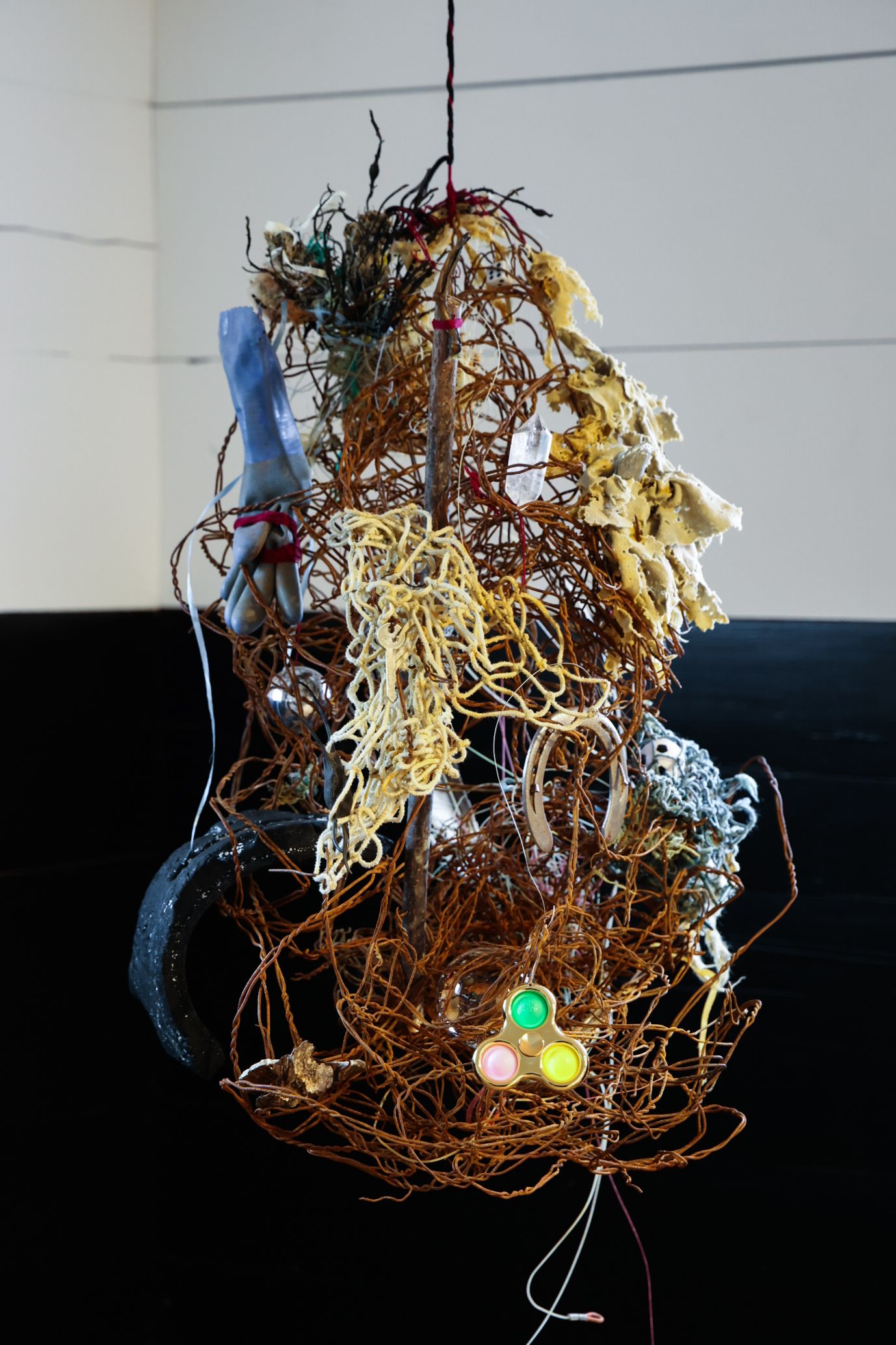 Talisman and device for interconnectedness with terra + witnessing the memory of the grounds and sacred land + protection + clearing Project Montauk psychic radiation, 2022 Found lobster trap, thread, double articulated quartz crystal, mushroom, rubbish, bird foot, foosball, key, crystal sphere, horseshoe, and other unnamed things 21 x 24 x 47” (53.3 x 61 x 119.4 cm)