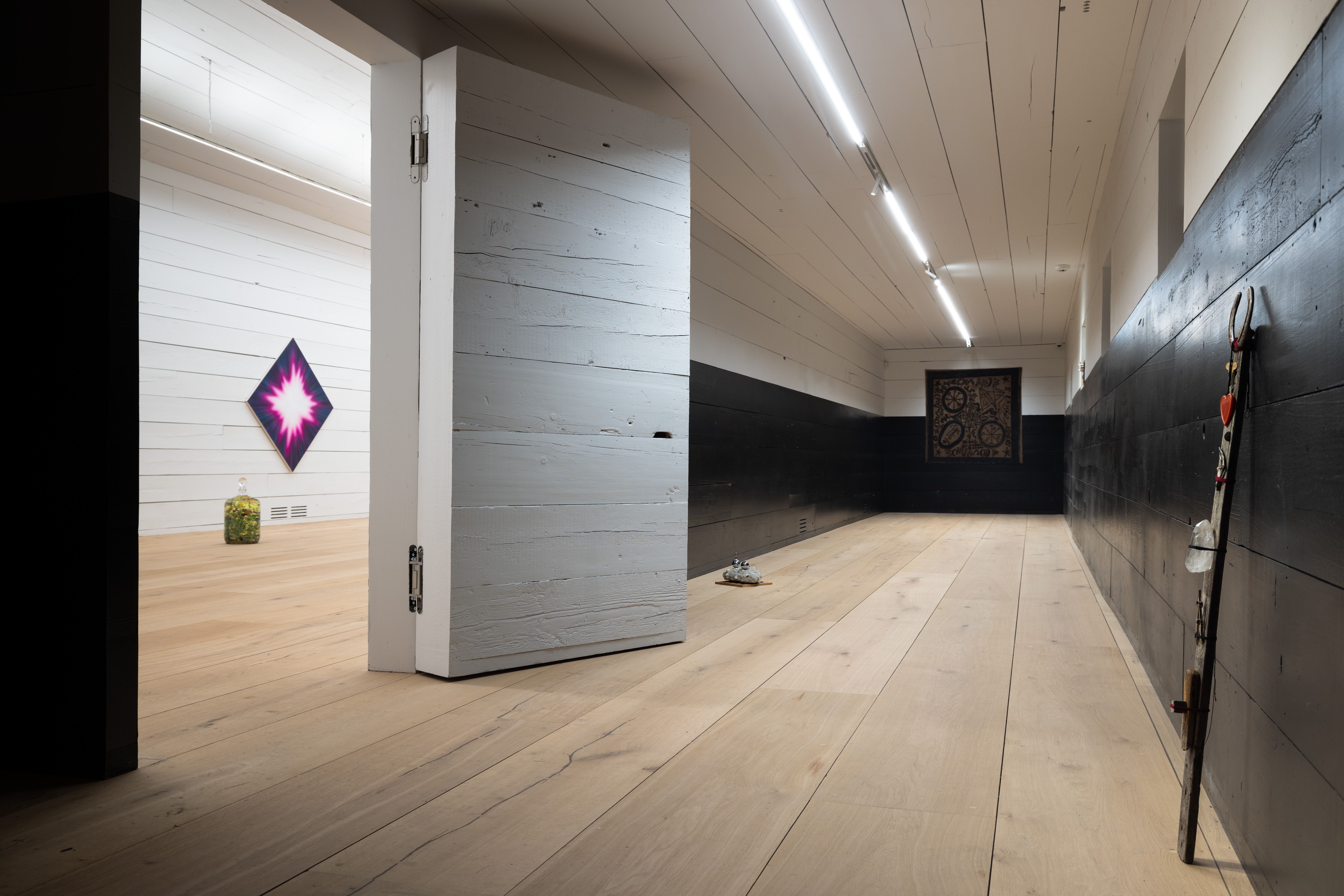 Spell for interconnectedness with terra, 2022 Pebbles and earth from The Ranch, Montauk ocean water, Montauk air, borosilicate glass and aluminum vessels, fire-charred wood, bolt from barn construction, electrical connectors from barn, rubbish from Montauk, coins, Montauk rubbish, Venetian glass vessel, preservative oil, crystal sphere, and other unnamed things 12 x 12 x 24” (30.5 x 30.5 x 61 cm)