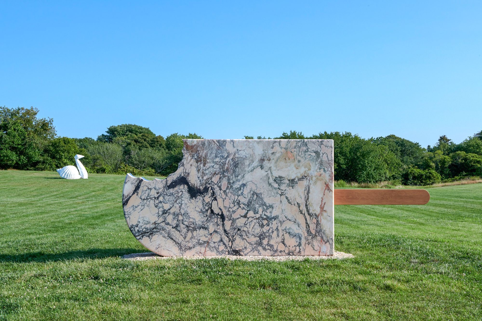 Large Creamsicle I, 2023, Marble, white oak, 68 x 181 x 24 in. (172.7 x 460 x 61 cm)